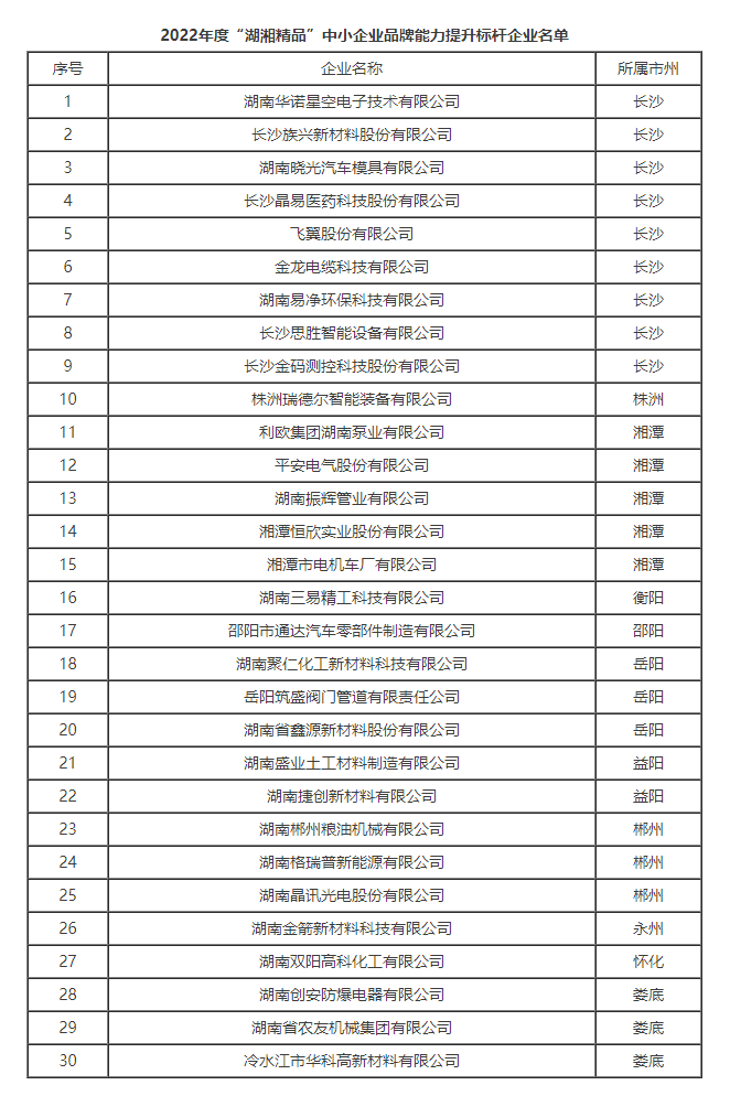 根據(jù)《“湖湘精品”中小企業(yè)品牌能力提升三年行動計劃(2021-2023年)》和《關于征集2022年度“湖湘精品”中小企業(yè)品牌能力提升標桿企業(yè)的通知》要求,經(jīng)試點企業(yè)申報、市州工信局推薦、專家評審及公示等程序,省工信廳遴選出30家企業(yè)為2022年度“湖湘精品”中小企業(yè)品牌能力提升標桿企業(yè),現(xiàn)予公布。