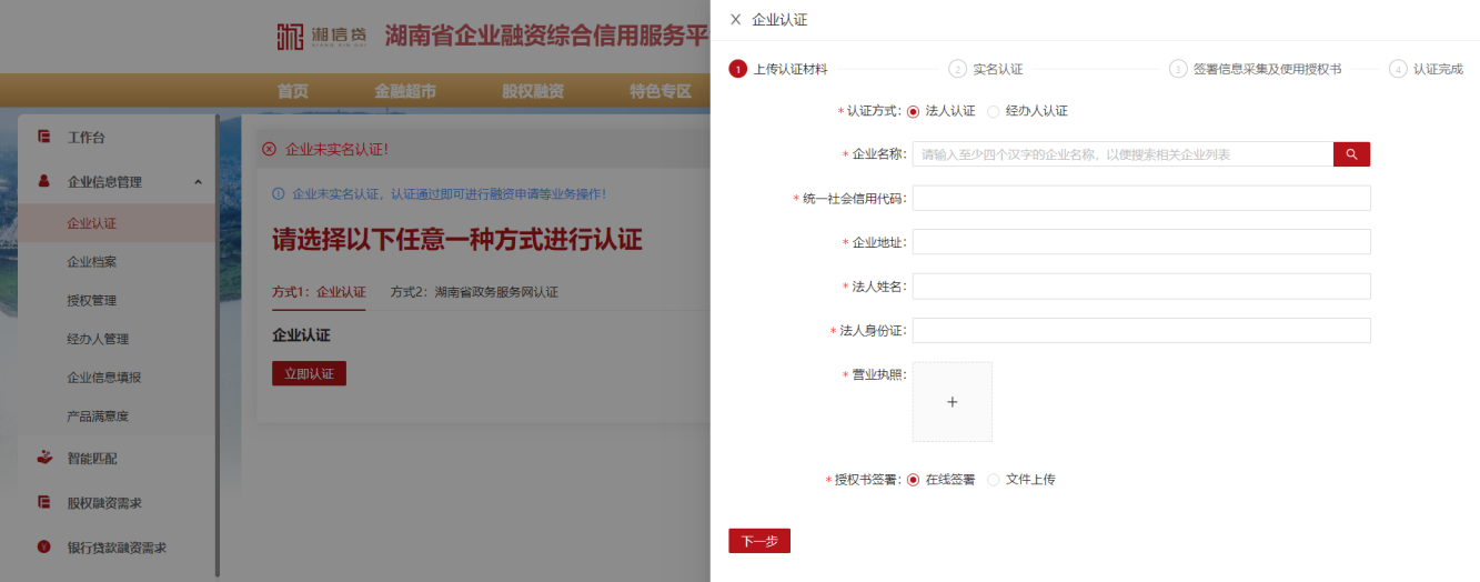 4、在企業(yè)實(shí)名認(rèn)證頁面,選擇認(rèn)證方式(企業(yè)認(rèn)證:需上傳營業(yè)執(zhí)照信息,湖南省政務(wù)服務(wù)網(wǎng)認(rèn)證:需在湖南省政務(wù)服務(wù)網(wǎng)開通了賬號),并按照認(rèn)證流程進(jìn)行操作。