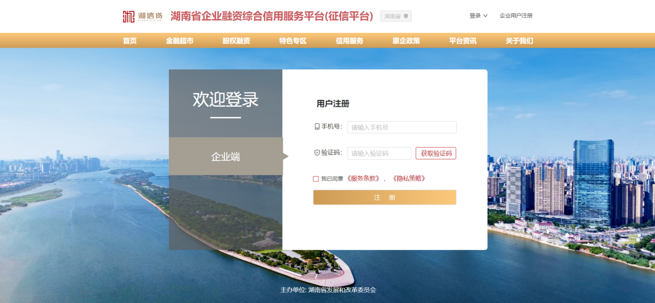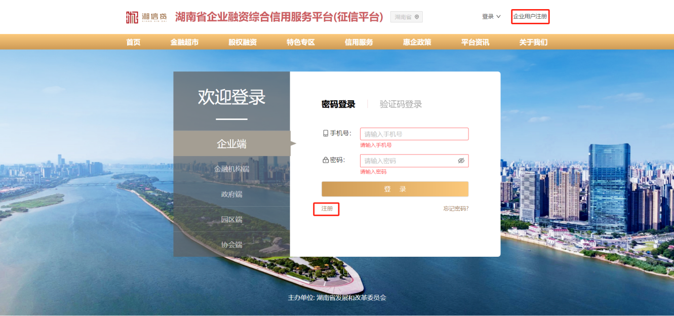 1、“登錄頁面”左下角點(diǎn)擊“注冊”按鈕或在“湘信貸”平臺網(wǎng)站右上角,點(diǎn)擊“企業(yè)用戶注冊”按鈕,進(jìn)入注冊頁面。