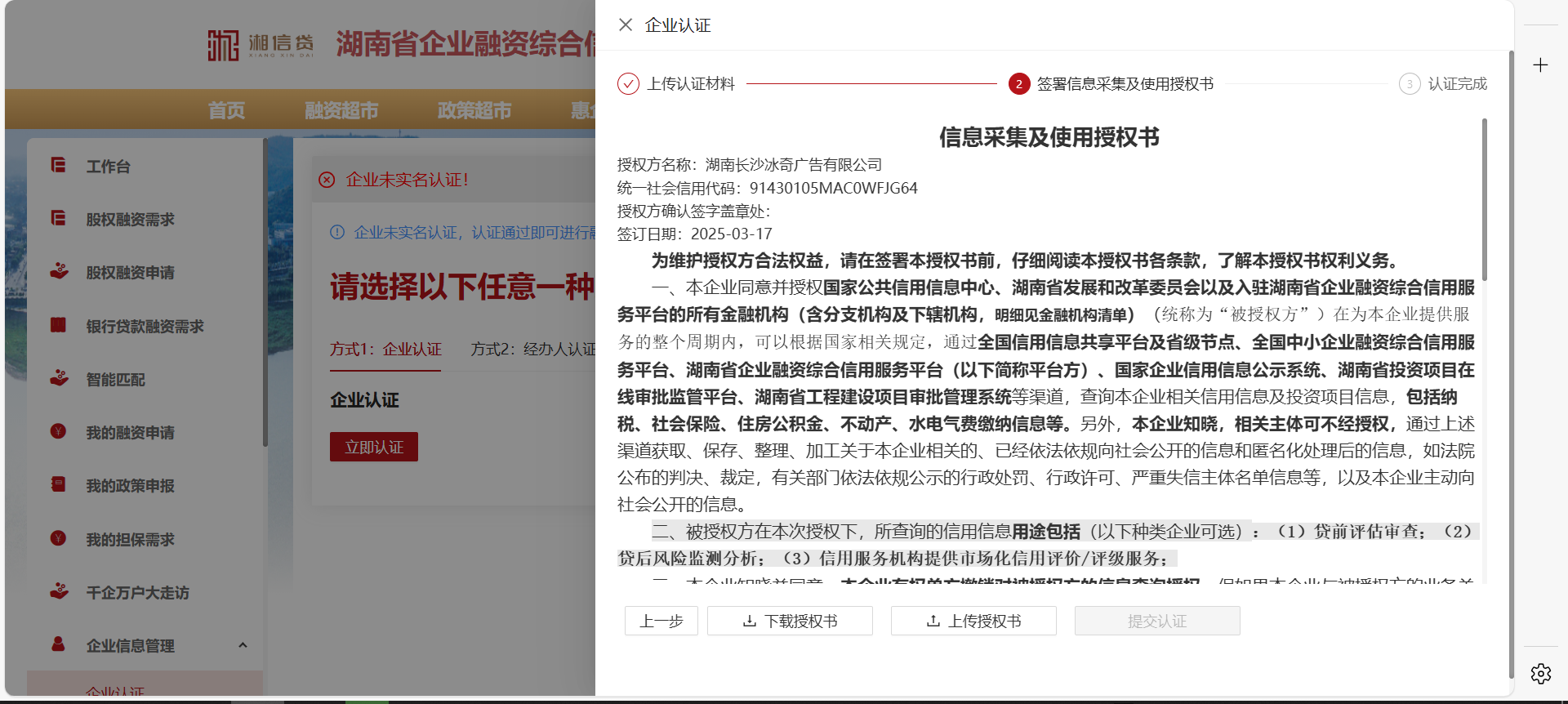 5、在完成企業(yè)認(rèn)證后,進(jìn)行企業(yè)信息采集使用授權(quán)書簽署上傳,允許平臺查詢企業(yè)相關(guān)基礎(chǔ)信息、納稅欠稅、不動產(chǎn)、水電氣繳費(fèi)信息情況。